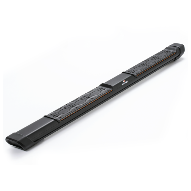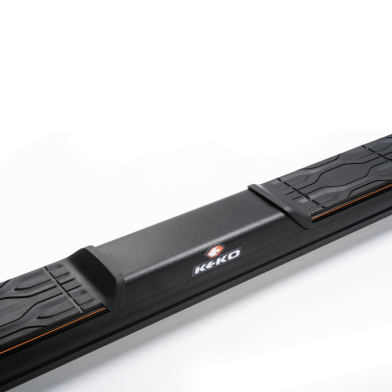 - Pisadera antideslizante con diseño exclusivo, sin tornillos aparentes y con perfil de color naranja aplicado a la pisadera con acabado negro texturizado y perfil de color gris aplicado a la pisadera con terminación
